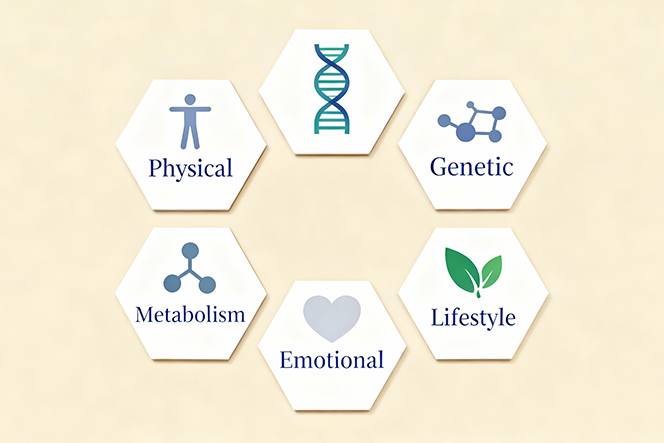 Only You Plus, sağlığı beş temel boyutta ele alır: Fiziksel, Genetik & Biyokimya, Metabolizma, Zihinsel & Duygusal, Yaşam Tarzı. Her birey için bu beş alanda veri toplanır, analiz edilir ve kişisel sağlık haritası oluşturulur.